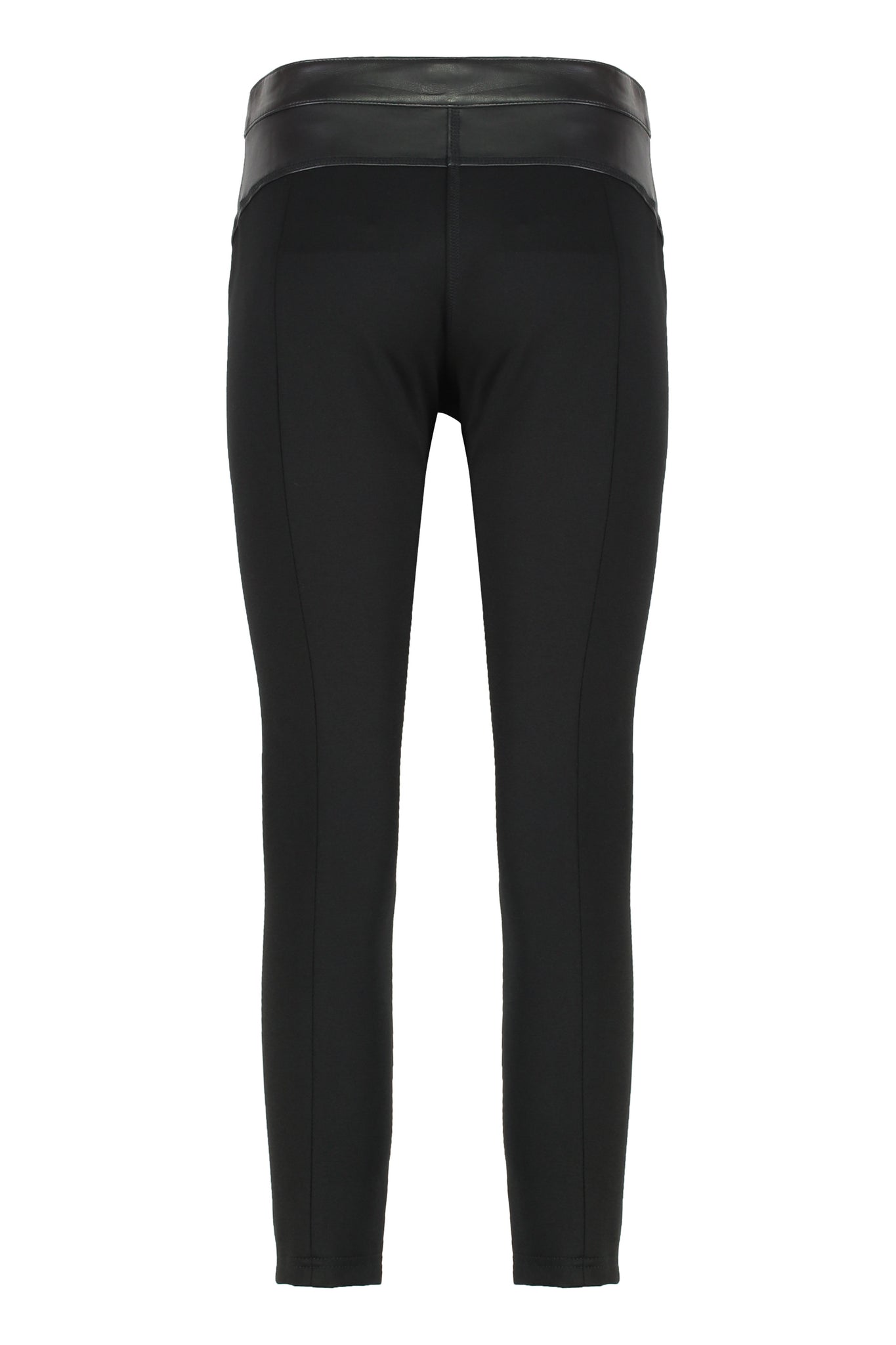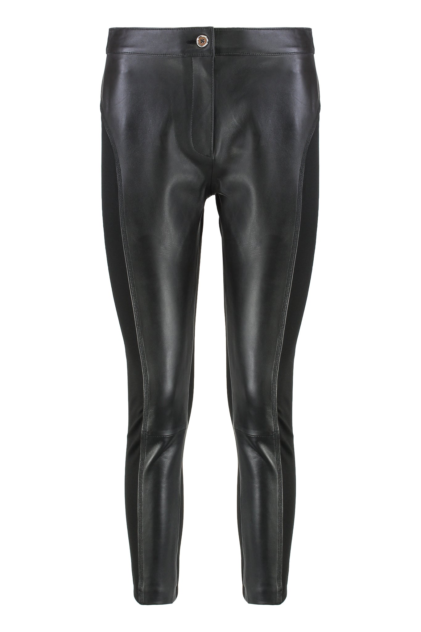 Skinny pants with fitted legs and a hidden zip front closure and visible button. The model features a bimaterial construction, characterized by the combination of soft leather at the waist and front and neoprene at the back, for a comfortable final result that adapts well to the fitted silhouette. Wear this piece with a leather jacket for a total rock glam look or pair it with an oversized jacket to add a touch of femininity to a everyday outfit.